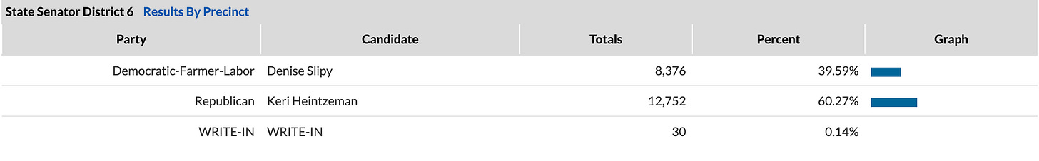 And finally, in MN State Senate District 6, Dem Denise Slipy lost, but, she did overperform Kamala by about 6.2 pts, and the last Dem to run by about 3 pts. It’s not much, but it does continue our trend of overperforming across the board, and when that comes to looking forward to 2026, that matters a lot.