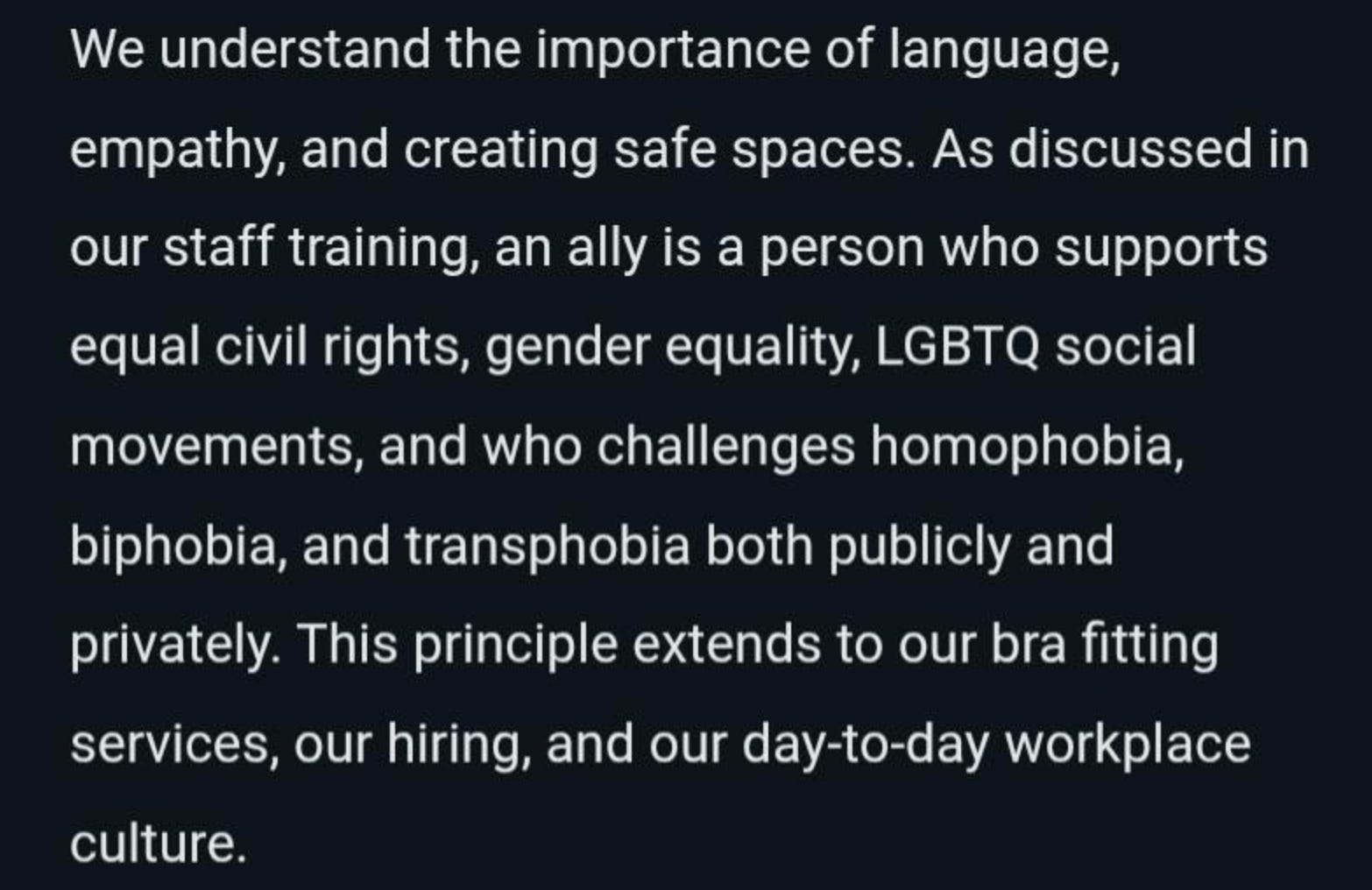 I have so many favorite parts, but I think the best part is saying that an ally “challenges homophobia, biphobia and transphobia both publicly and privately.” That shows these aren’t just words on a page, theyaren’t just trying to shut down the conversation. They train their staff and they know what the training means. This is the kind of pushback we need now. And not just in the US, the UK has been even more rife with transphobia than the US, if you can believe that.