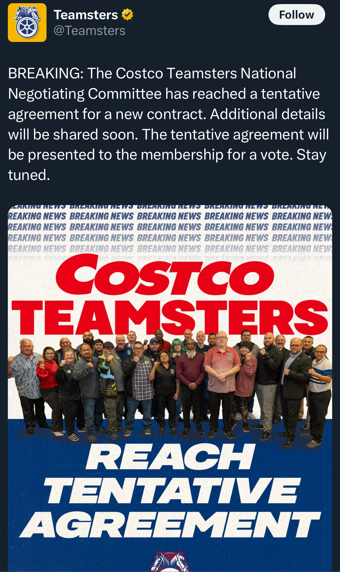 Costco and Teamsters reached an 11th-hour tentative deal, so there will be no strike. The Teamsters represent 18k employees across 6 states. It’s not a huge amount of Costco workers, but different stores were trying to get non union workers to scab and this would have negatively effected Costco as a whole. Plus a union win is always a huge win.
