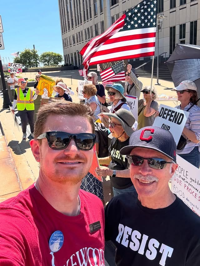 Wed, July 23 - Ohio State Senator, Tristan Rader joined the Wednesday at Bernie’s weekly protest at Senator Bernie Moreno’s Cleveland office.
