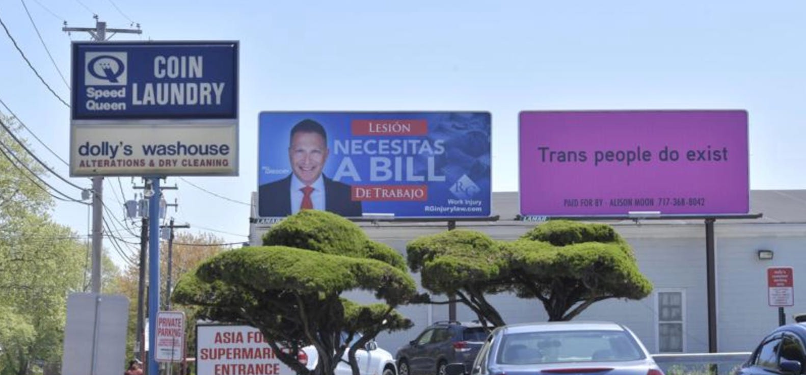 Moon is unemployed but said she’s looking to get back to work using her degree in music from Lebanon Valley College. Asked how she can afford the billboards, Moon referred to herself as a “trust fund baby.”