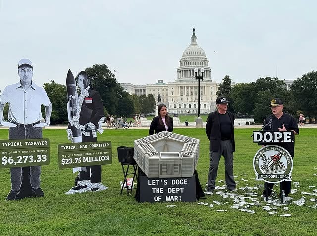 YESTERDAY - Ben Cohen, of Ben & Jerry’s, introduced his new government department. It’s called DOPE (Department of Pentagon Excess.) It was a stunt on the Capitol lawn to bring attention to how much money goes into the Pentagon.