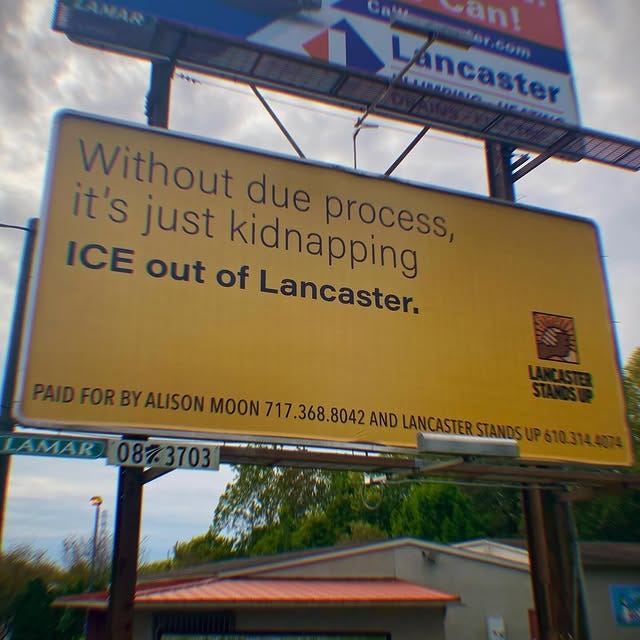 Sat, Sept 27 - A new billboard went up on Prince St. that says “Without due process, it’s just kidnapping. ICE out of Lancaster”