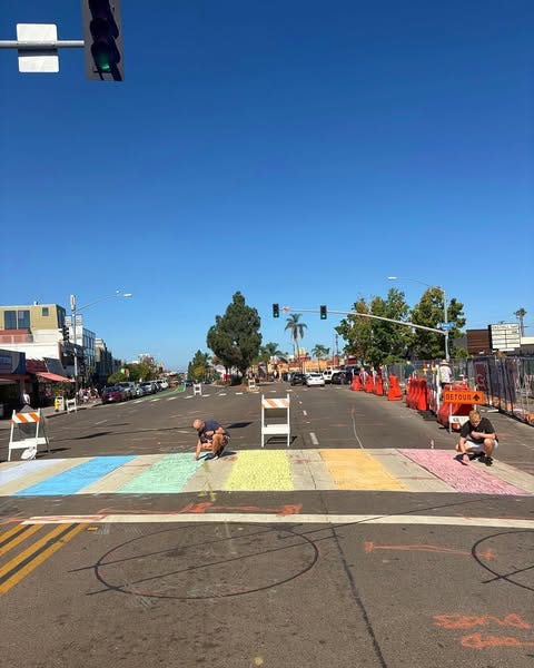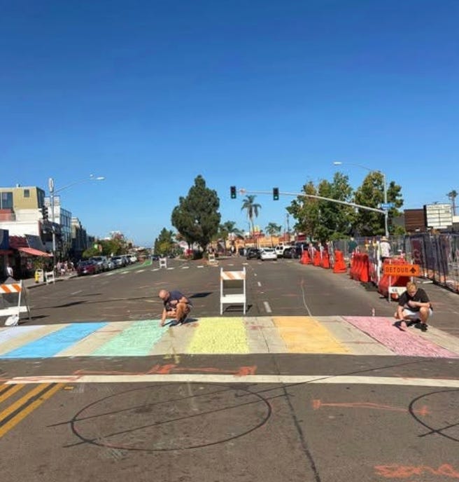 Now, Hillcrest currently doesn’t have any permanent rainbow crosswalks because they all had to be ripped up to make way for their new Pride Promenade which will turn part of Normal st. into a queer family friendly pedestrian paradise.