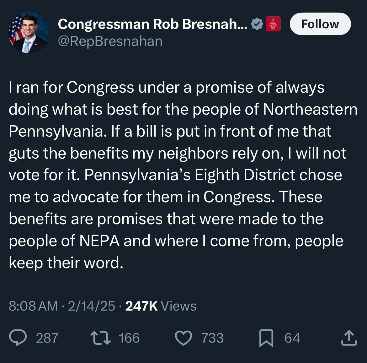 Republicans are not remotely on the same page when it comes to the massive continuing resolution to fund the government, which the Dems are fully willing to shut down as leverage to get Musk out. DT’s lackeys want to cut social security and medicare, and Republicans in purple districts are saying that’s a red line. Some of them spoke to Politico, but one, Rep Rob Bresnahan (PA-08) posted it on Twitter, as a kind of very public threat to his colleagues.
